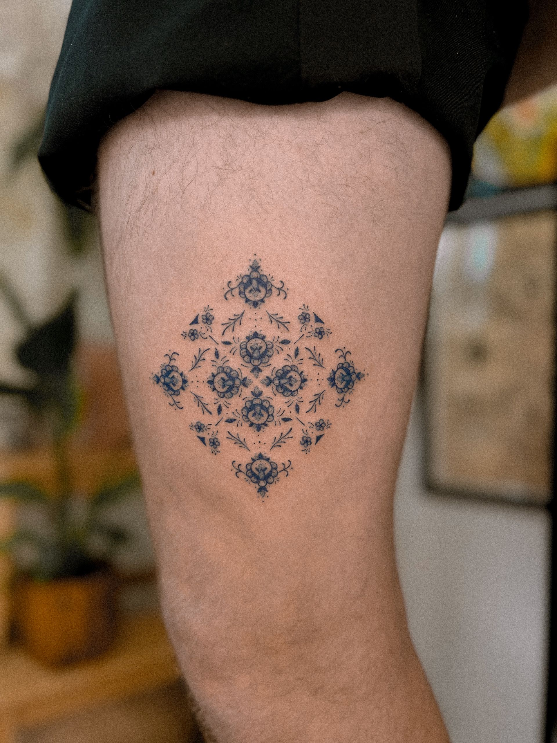 Uma mulher está parada em uma sala com uma tatuagem no braço.